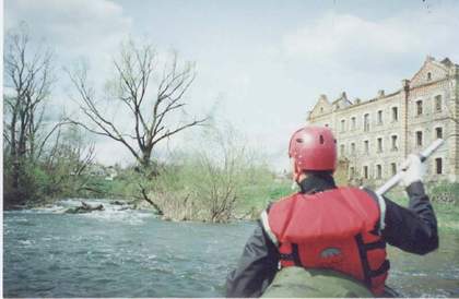 порога в левой протоке. Рядом с порогом очень красивое 3-хэтажное здание
